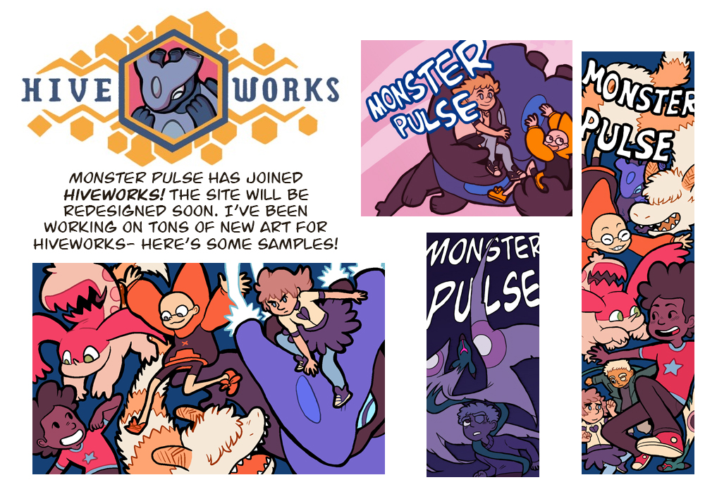 Hiveworks! This is a great thing because it means I(ll be able to support myself more via my comic, and be part of a great network of other comics and creators. The site will be reconstructed soon, but don(t worry, nothing will be different about the comic and it will continue to update MWF as it always has. I plan on sticking with Monster Pulse for the long haul, and Hiveworks will probably help me keep going with it. And thanks to all of you readers for being so invested.