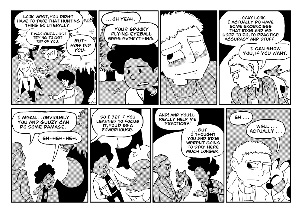 If this were a different kind of comic there(d probably be all kinds of "Abel using Rixis to look up skirts" shenanigans. (