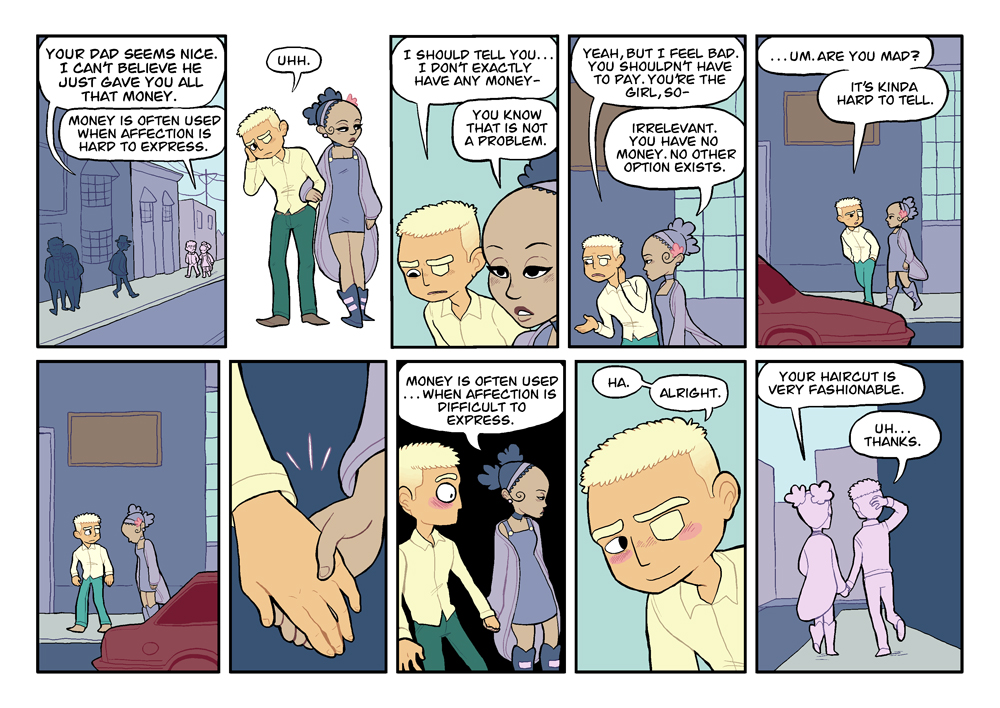 Originally I had Violet refute Abel(s statement in panel 4 in more concrete terms, saying "Gender roles of that kind are irrelevant" or something. But it was cut for space and made the overall conversation a bit clumsy. I wanted y(all to know though, that I didn(t intend that as an endorsement of such thinking.