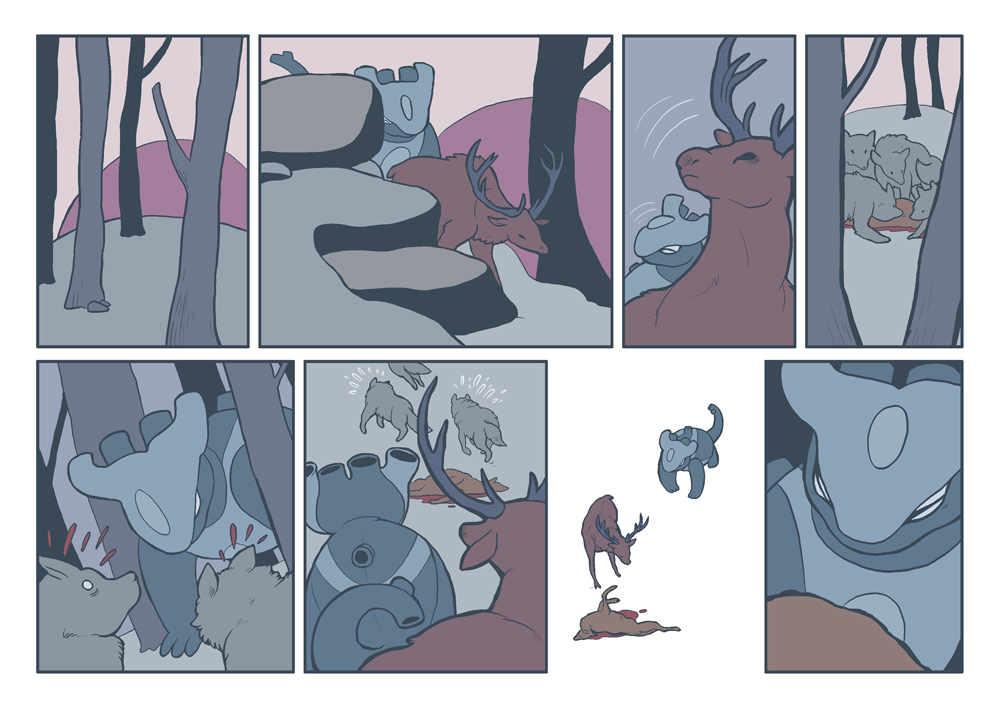 Ayo and the deer on a walk in the woods.