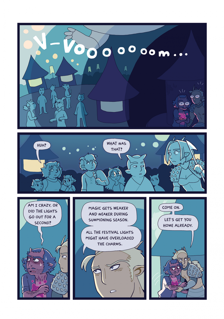 Okay, so I realized that even though the story stated that Harken is a guard, I haven't really shown any other guards in the comic, so for all you guys know, he just dresses like that for fun. So- here in the second panel, another guard! I'll try to make more of an effort to show them when it makes sense to do so. There's a bunch of background elements to the world of Moonforest that I keep in mind but don't necessarily always show, but I'll try to include them more as needed.